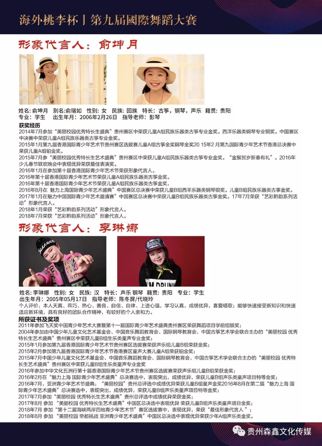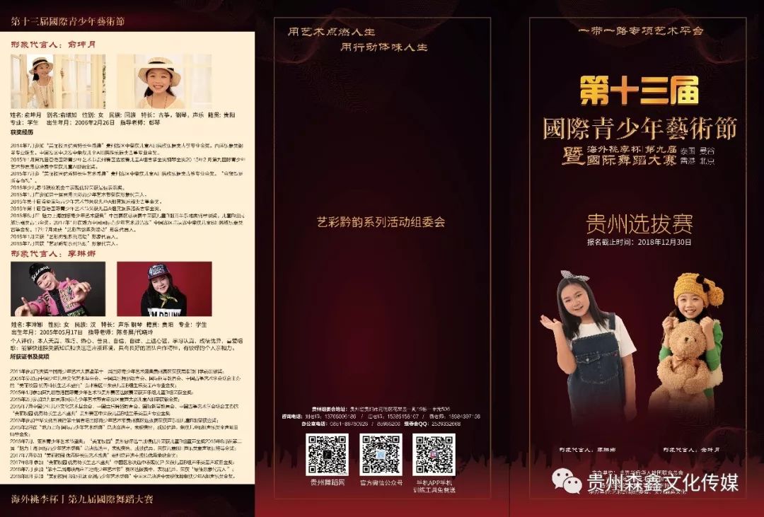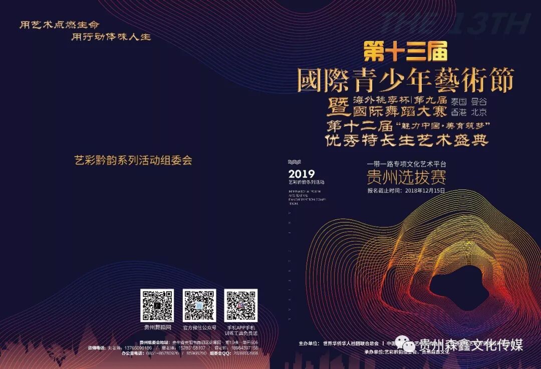 2019【第13届国际青少年艺术节】、【海外桃李杯-第九届国际舞蹈大赛】、【第十二届“魅力中国、美育筑梦”优秀特长生艺术盛典】等,是艺彩黔韵系列活动贵州赛区艺术人才选拔活动。